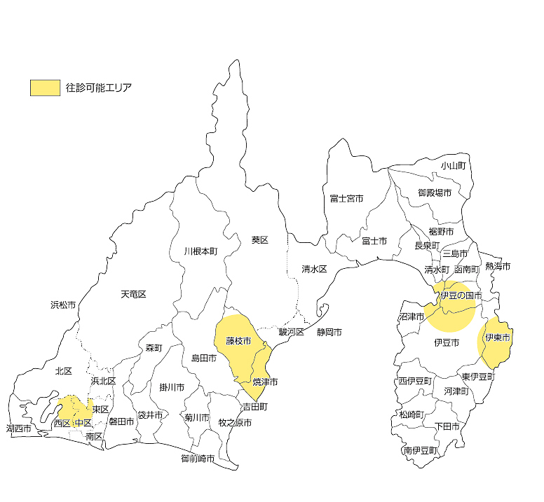 (地図に色を塗っていない地区でも往診できる場合がございますので一度ご連絡下さい)